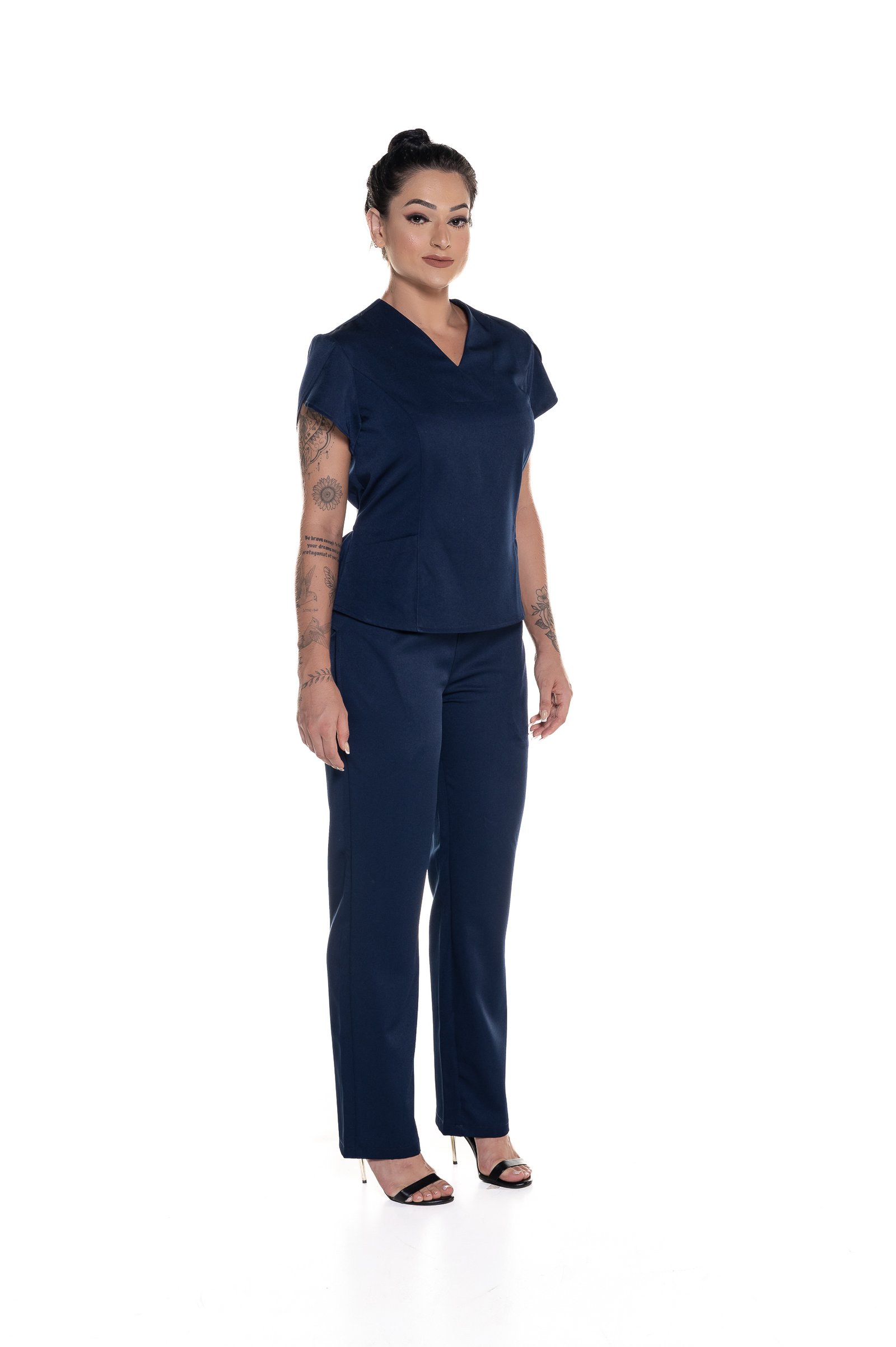A blusa possui recorte princesa e amarração nas costas, o que valoriza a silhueta e permite ajuste, além de mangas tulipa que trazem um toque delicado à peça. A calça possui cós de elástico para mais conforto durante todo o expediente e bolsos laterais embutidos.